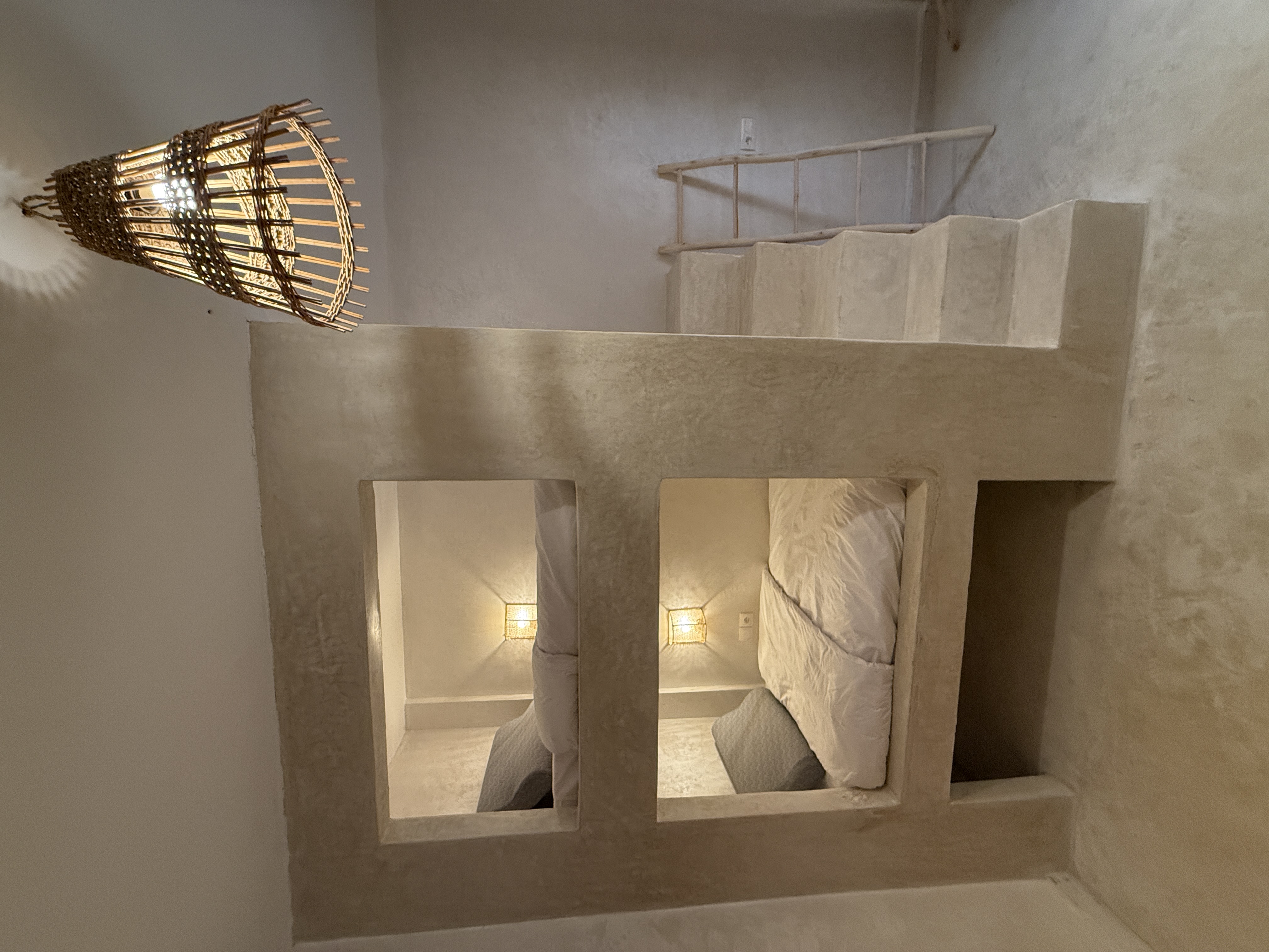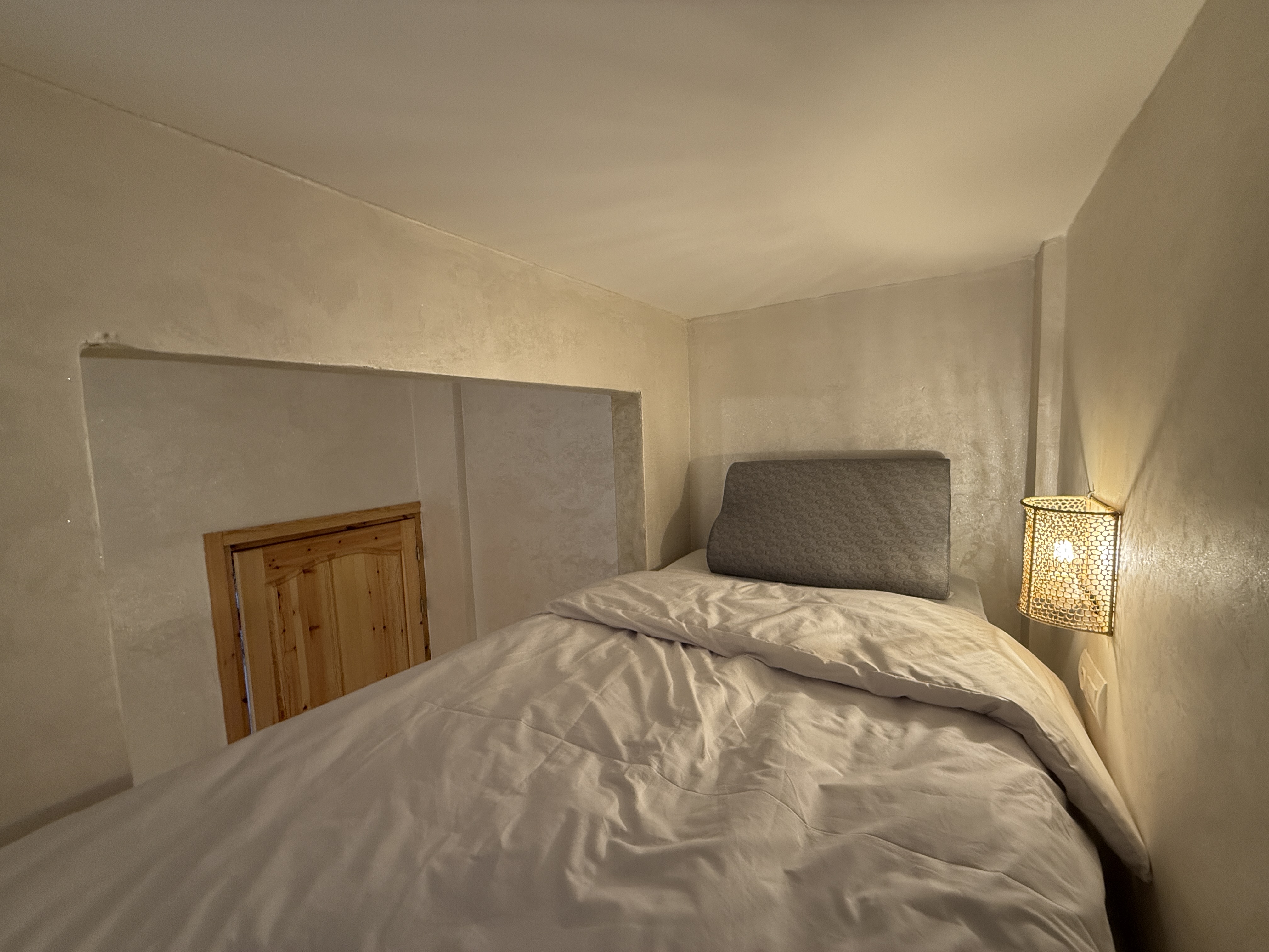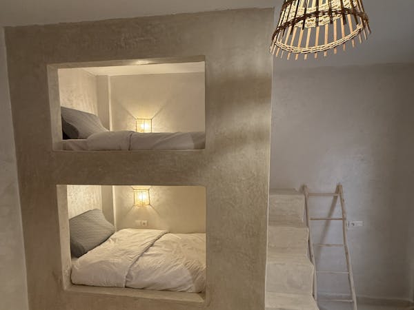 Premium dormitory for 4 people including: 2 bunk beds made of masonry to avoid the nuisance of movement, with privacy curtain, storage shelf, reading light for exclusive comfort! 1 bed 90x200cms + shelf on the wall side 20 cms wide x 200cms Personal wardrobe locked. Shared bathroom, memory foam pillow !